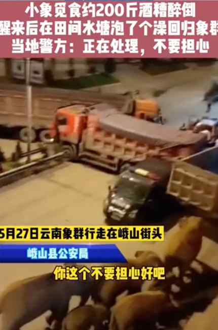 据峨山警方消息,2021年5月25日,巡特警大队接到上级指令称峨山县小街街道有野象出没。11时许,在老熊箐水库附近,发现象群。其中一头年幼小象当天觅食了大约200斤酒糟“醉倒”,因睡过头脱离象群。小象醒后在田埂的水塘里“泡了个澡”。5月25日傍晚,醉倒小象已回归象群。28日凌晨2点,野象群已进入安全区域。重要提醒:亚洲象受惊吓会对人类发起攻击,若遇亚洲象,应尽快避让!