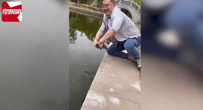 5月27日,江苏。男子趴在池塘边,伸出一只手打算徒手抓鱼。没想到鱼一动不动,男子徒手将其抓上来,一旁女子大笑,随后男子将鱼放生。网友称,这鱼吃了影响智商。
