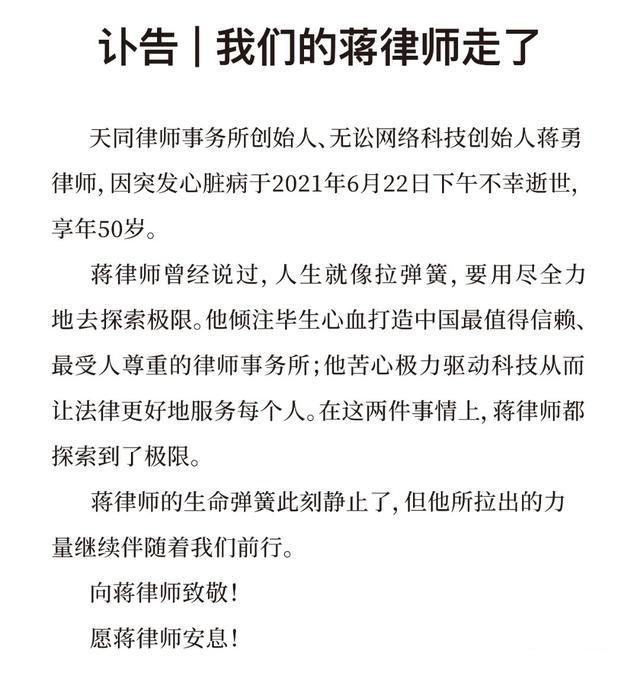 天妒英才!天同律师事务所创始人蒋勇逝世,享年50岁