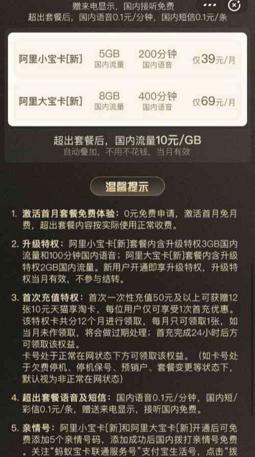 近期,阿里宝卡迎来新升级换新,阿里小宝卡和阿里大宝卡均进行了升级。其中阿里小宝卡套餐39元/月,包含5GB国内流量,200分钟国内语音;阿里大宝卡套餐69元/月,包含8GB国内流量,400分钟国内语音;赠送来电显示,国内接听免费。超出套餐后,国内语音0.1元/分钟,国内短信0.1元/条。流量超出套餐后,国内流量10元/GB。