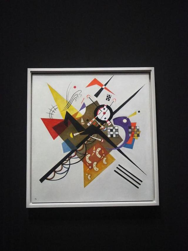 康定斯基,《白色之上II》,1923年,布面油画,1976年由尼娜·康定斯基女士捐赠,蓬皮杜中心,巴黎,法国国家现代艺术博物馆-工业设计,澎湃新闻记者现场图上海西岸美术馆的展出里,一幅1923年的《白色之上II》是康定斯基的心爱,曾挂在魏玛包豪斯的家中。古根海姆的展品中,一幅同年创作的《构图8》,在画家本人看来,是一战后自己在魏玛时期的巅峰之作。画中有许多线条和半圆形元素。白色背景上巧妙的黄色和淡蓝色与构图中四处分布的各色小型元素相互呼应。画面的主导形状是左上角的紫芯黑色大圆盘,四周的粉红光晕在圆盘和白色背景之间起到过渡作用。黑色大圆盘右下角的红色小圆圈似乎正将圆盘拉向观众,而中心的紫色则产生相反的效果,试图把形状固定在背景上。相互嵌套的三角形如山峰,这在形式上给作品带来了某种和谐与宁静。
