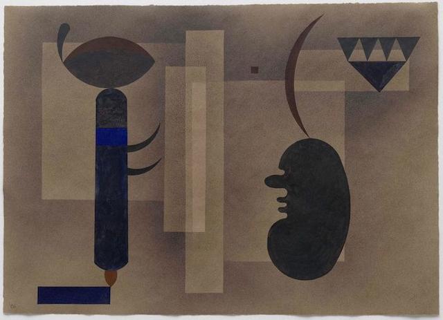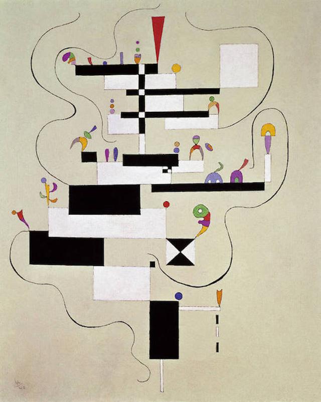 复调也称对位法,是一种多声部音乐,包含两条或两条以上独立旋律,作曲家要和谐地结合这些独立旋律。勋伯格的“十二音体系”本质上也是对位法。投射在康定斯基的画面上,表现为形状、颜色遵循着某种隐秘的对应关系。伯尔尼美术馆收藏的《再》(1940)可以更形象地说明。