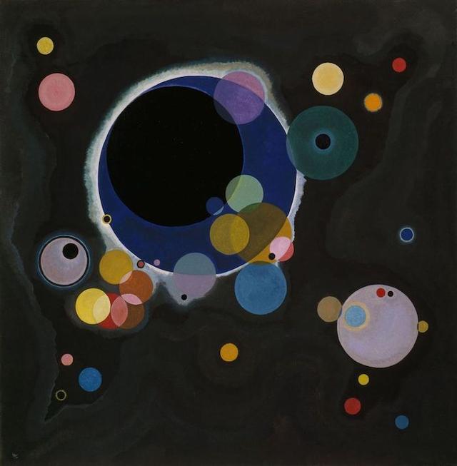 康定斯基《构图8》1923云赏《构图8》时,耳边循环着康定斯基崇拜的勋伯格1917年的代表作《升华之夜》。这是一首根据抒情诗《净化之夜》改编的弦乐合奏,带有瓦格纳的现代风格,兼有更浪漫的勃拉姆斯的古典风格,使不协同的音乐得到“升华”,和谐,归于宁静。如果把康定斯基画中左上角的圆盘想成月盘,那么乐曲的起伏、融合、冲突,是否能勾连起眼前的画作?