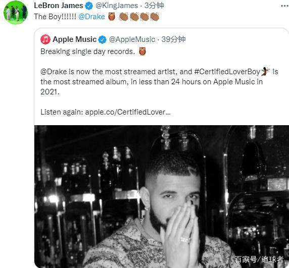 Drake新的音乐专辑《Certified Lover Boy》于9月3日发行,而发行之后马上打破了Apple Music的单日播放量纪录,詹姆斯转发恭喜Drake破纪录:小伙子,为Drake鼓掌(4个鼓掌和1个猫头鹰表情)。