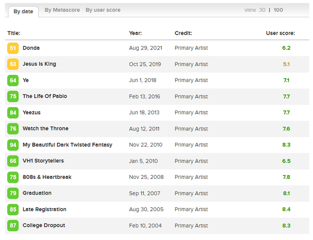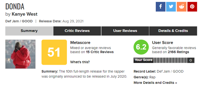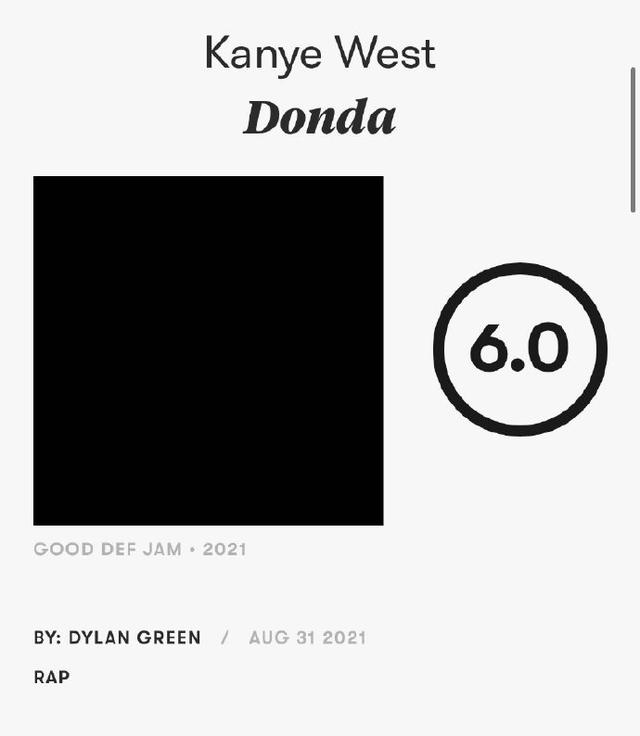 综合15家权威乐评机构,新专辑获得历史新低————51分!比上一张专辑《 Jesus Is King 》低两分!在今年所有的专辑之中,排名倒数第二!