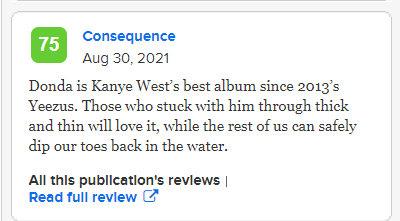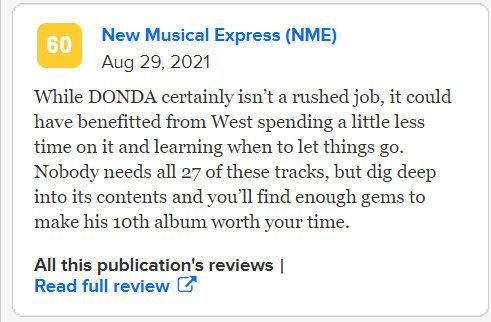 虽然《DONDA》肯定不是一份仓促完成的作品,但Kanye West如果在这上面花的时间少一点,学会什么时候放手,对它可能有所好处。没有人需要这整整的27首歌,但深入挖掘它的内容,你会发现足够的宝石,这使得他的第十张专辑值得你花时间去听。”