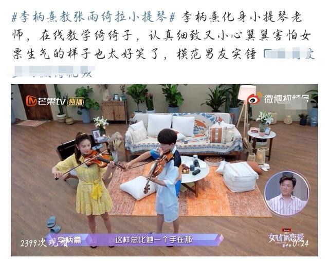 在节目中,李柄熹亲自教张雨绮小提琴。之前在节目中李柄熹也透露过,自己4岁的时候就开始拉琴,所以专业能力是绝对杠杠的,教学的时候也是比较严格的。但在面对自己喜欢的人的时候,好像就不是这个样子了。李柄熹在教张雨绮的时候,语气非常温柔,而且很有耐心,一点一点跟着张雨绮一起拉,还很贴心的给她数拍子。这一幕让不少网友都想到了韩剧中的片段,满屏的粉色泡泡都要溢出来了。