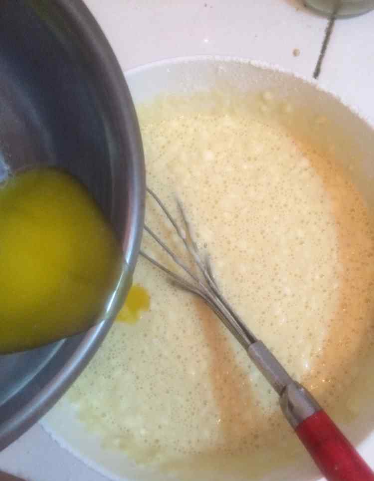 5 面粉加入后还有很多小圪塔不用管他,加入融化的黄油!