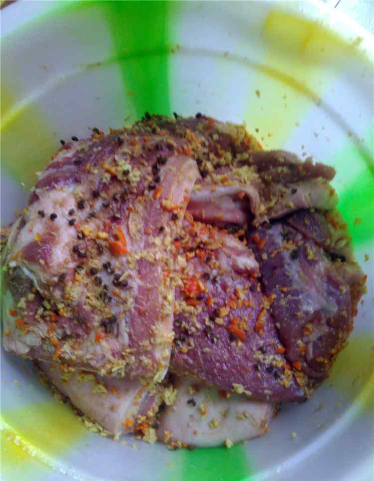 4 继续调入适量盐,花椒,五香粉,姜末,混合均匀后,放置两天。期间给它翻次面。