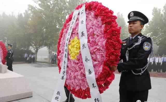 四名公安礼兵怀着崇敬的心情给烈士敬献花圈,全体民警、文职、辅警人员向烈士鞠躬默哀,大家表情严肃,沉浸在对烈士的深深怀念之中。