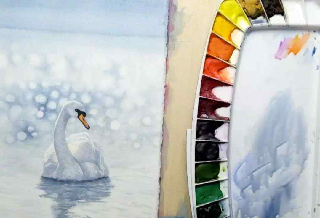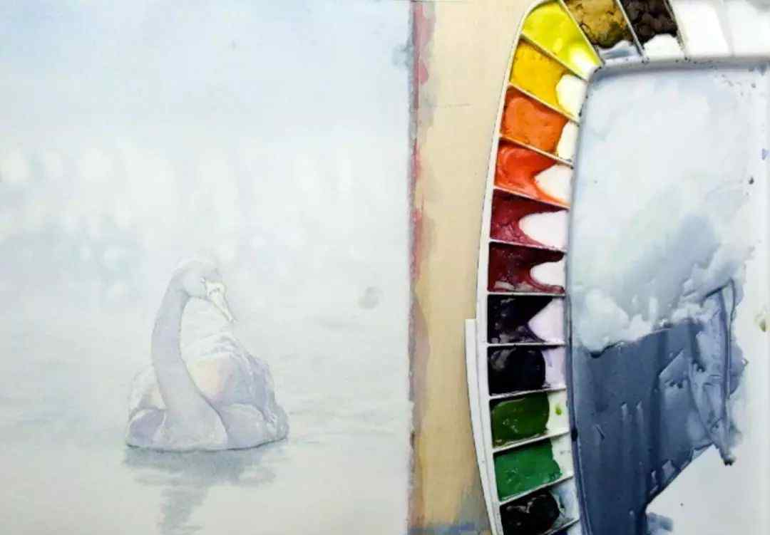 蘸取一部分颜色的情况下再加一些水,那样会让非常重的深灰色调变的很浅,立即画到白天鹅的颈部部位铺一层色调较浅的背景色。