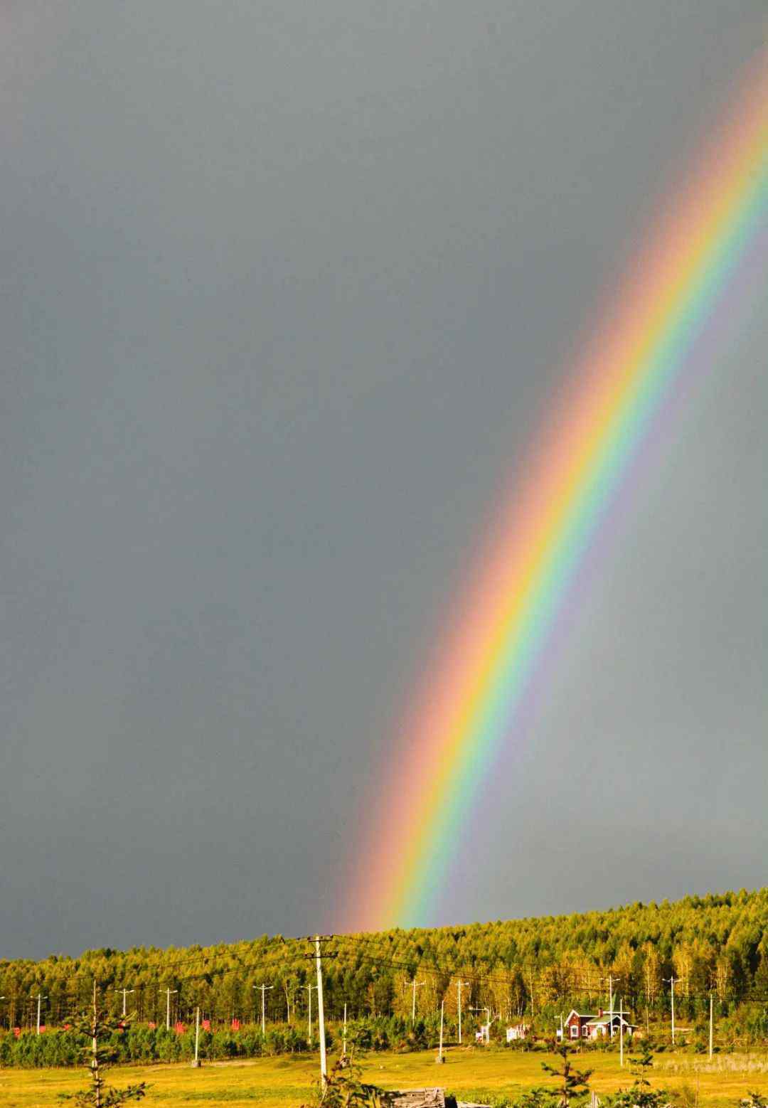 然后他继续往前开去,大雨瓢泼,进山口被封山架拦住。我们没见到驯鹿,但大雨中,出现了两道光柱一般的巨大彩虹。