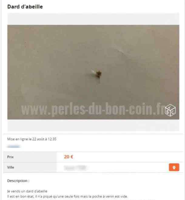 - 卖家秀:蜜蜂的毒刺,状态良好,它只蜇过我一次,感觉没啥用了,卖给你们吧。