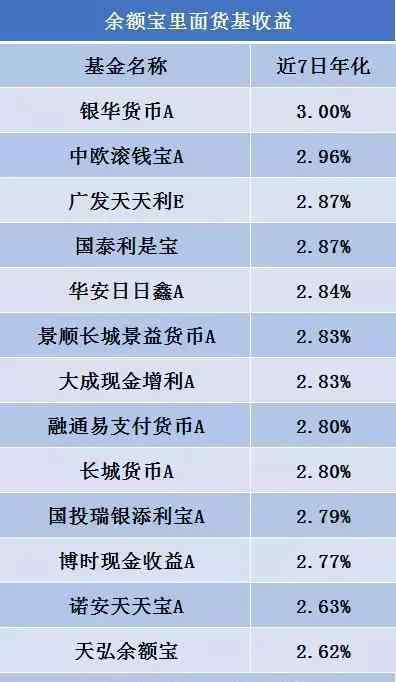 最近余额宝在低收入的道路上越走越远。目前余额宝停靠的几种商品收入基本在3%以下,其中最高的银华币A 7日年化收入仅为2.99%,余额宝收入仅为2.62%。