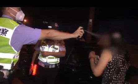 警察不得不通过强制措施把他们带到警车上。警车里的女司机依然不死心,一脚猛踩车门,不肯配合。无奈之下,警察向女子喷了辣椒水,女子冷静下来配合警方执法。警察用强制手段把他带到了警车上。