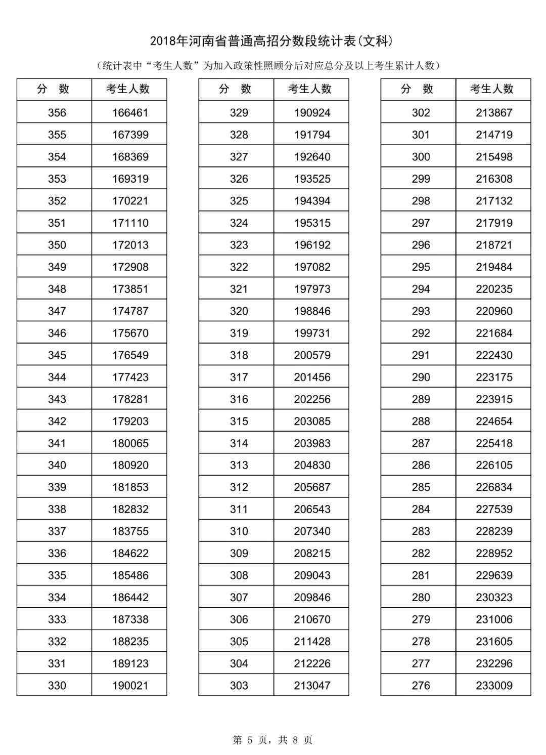 2018高考文科一分一段表