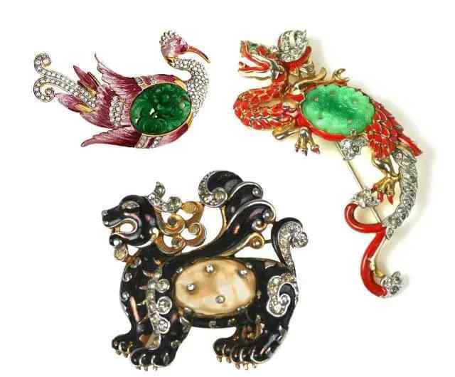 中国风元素,用镀金,珐琅,水钻,人造翡翠,惊艳。这个系列有龙、鹤、金鱼、独角兽、乌龟等形状。