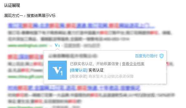 百度加V认证,又称实名认证,相当于网络实名身份证,用于提高商家的真实性和完整性。通过收集网站及其背后运营实体的资质、真实性认证、可信行为、消费者承诺意愿等数据,将网站的综合信誉以信用评级的形式呈现给网民,作为网民决策的参考。