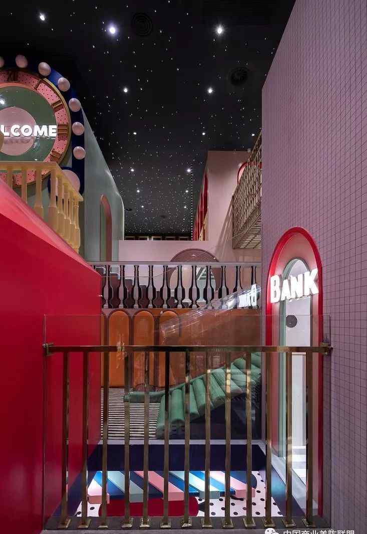 明星空的背景和搞笑的迎宾桌,在镜面天花板的叠加下,为前台营造出一种突破维度的超现实感,暗示着消费者即将进入一个只存在于童话中的梦幻城市。
