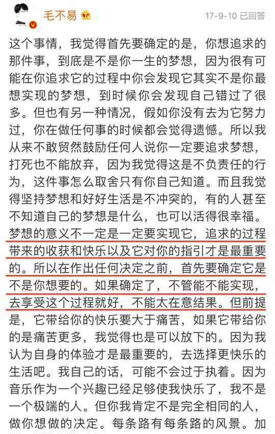 大家都说毛成名后不容易,还是那么卑微善良,还是以前那个温柔细腻的小男孩。成名之后,他依然保持着自己的真诚和真实。永远不要害怕展示真实的自己。有人问毛不容易: