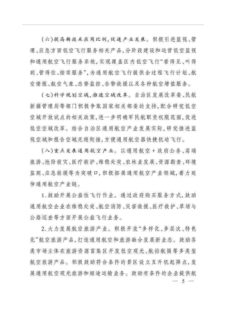 通过加大一般机场建设力度,建设低空航线网络,建立完善的低空安全监管和通用航空空飞行服务体系,自治区低空航班基本实现常态化,通用航空空年飞行量超过20万小时。计划建设5个以上通用航空空产业集群,力争成为全国通用航空空发展综合或专业示范区。