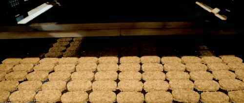 压实后变成整齐的一排排的麦片饼!送烤箱用文火烘干水分,完成制作。之后可以送去包装。