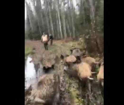 视频一经发布,就吸引了人们的围观,一个俄罗斯社交平台上的累计播放量一夜之间达到了25万人。在这段不到一分钟的视频中,一群野猪在森林里的路上大胆地跟在猎人后面,不停地尖叫,仿佛在乞求猎人:“请快抓住我!”却发现猎人无动于衷。野猪更焦虑,它们在“追”猎人。