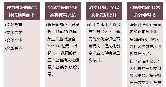 【文化创意产业背景】随着消费升级和全民文化意识提高,我国文化创意产业成为新的经济增长点;十八大以来,在政策、经济、社会和科技的共同推动下,文化创意产业的发展趋势不断改善
