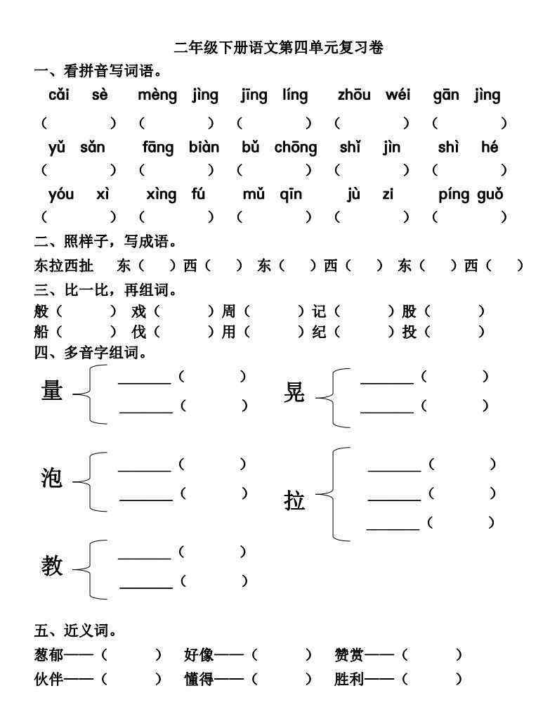 一什么水壶填量词 部编版语文一二年级(下)第1-4单元基础知识复习卷(含答案)