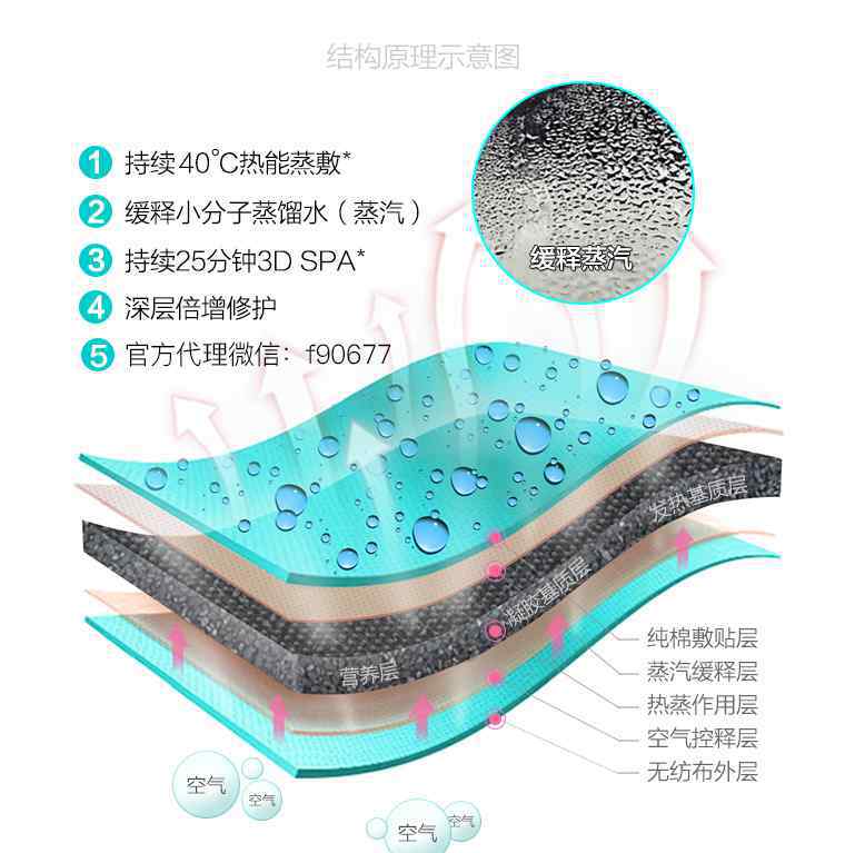 蒸汽面罩分为五层:①纯棉敷层②蒸汽缓释层③热蒸作用层④空空气控释层⑤无纺布外层。蒸汽面罩用热能在40℃下连续蒸,连续释放小分子蒸馏水(蒸汽)25分钟,深度倍增修复。