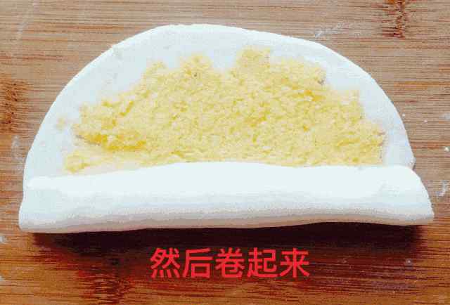 4.上下重叠,刷一点油,卷成一卷,切成和蜗牛壳一样大小的段;