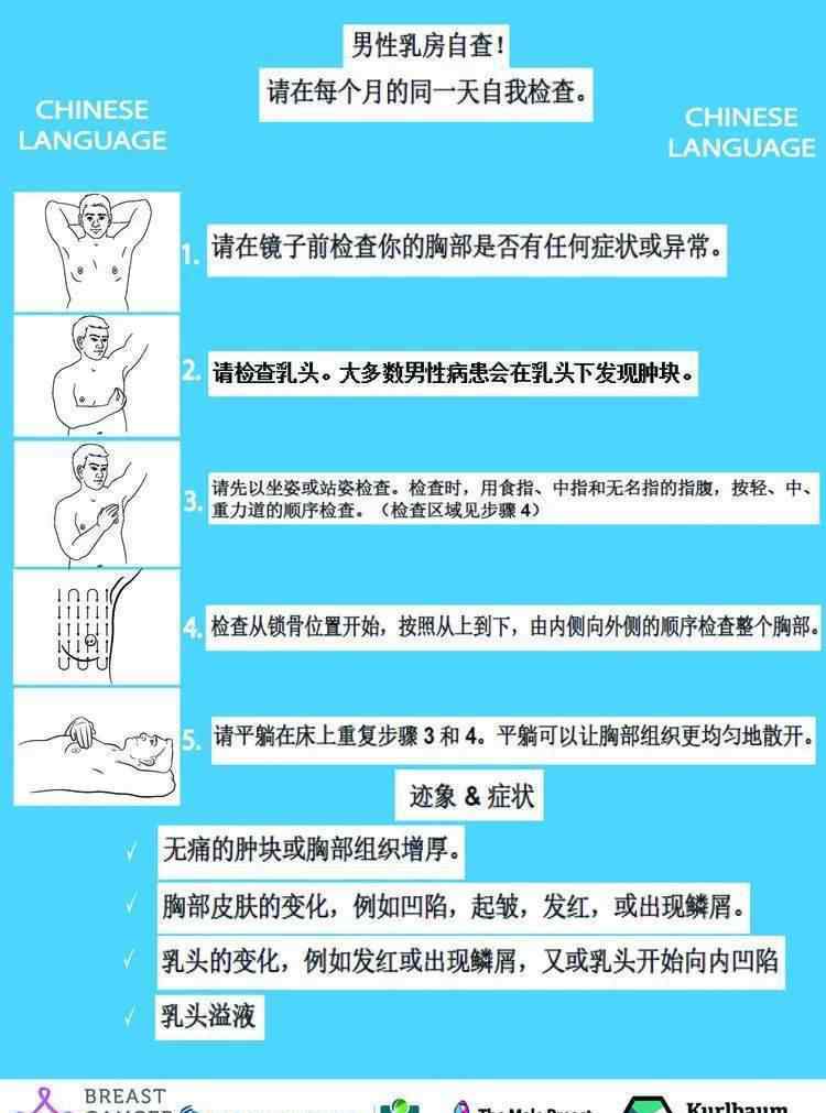 1.遗传因素:据资料显示,男性乳腺癌患者的基因突变率高于女性。如果男性有BRCA1/2基因突变,建议从35岁开始乳房自查。