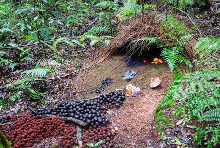 澳大利亚和巴布亚新几内亚的园丁以其奢华的“建筑”结构吸引女性而闻名。作为求偶策略,他们用植物的果实装饰“亭子”。之后,这些果实中的种子会生根发芽,从而带来新的植物。这种鸟被称为“鸟类的建筑师”。在求偶期间,雄性用树枝建造拱门或亭子,然后投入到雌性的青睐中,带来各种五颜六色的小物件,包括瓶盖和浆果来吃。。最后一个有钱的怎么了。。。