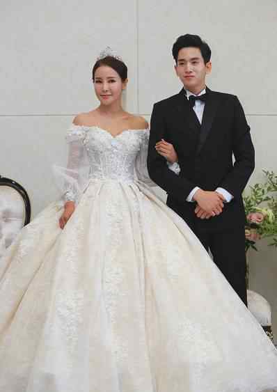 韩国43岁女歌手米娜(Mina)(原名沈玟雅)与26岁男子组合SoReal成员刘Phillip(柳弼立)举办结婚典礼,浪漫热吻撒狗粮。