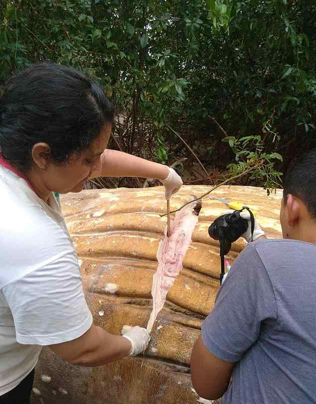 我们仍然不知道鲸鱼是如何到这里的,但在过去几天里,海浪相当大,可能把它抛进了内陆的红树林“,海洋专家Renata Emin说。