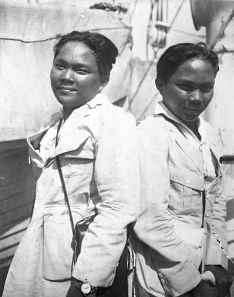 1930年时的Godina双胞胎。这对双胞胎出生于1908年的菲律宾,后来前往美国,开始表演杂耍。他们在骨盆处相连,这在男性连体双胞胎中非常罕见。