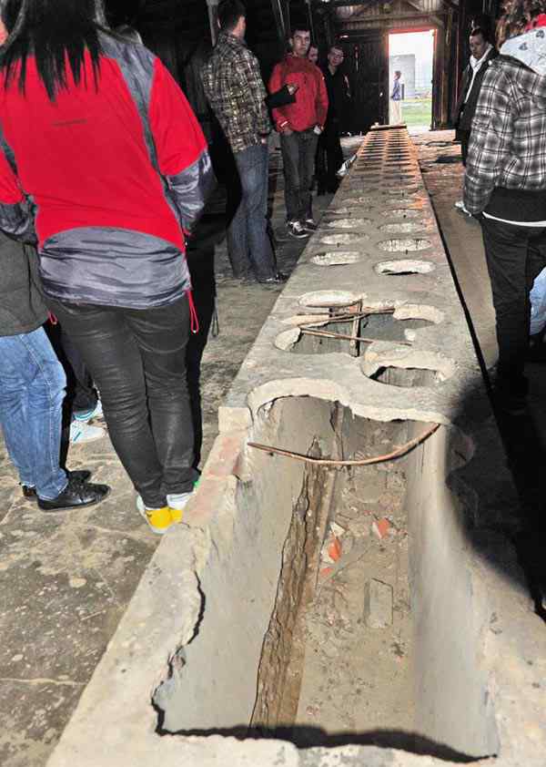 集中营马厩房内中间的圆洞长池就是囚犯的厕所(于世文摄)
