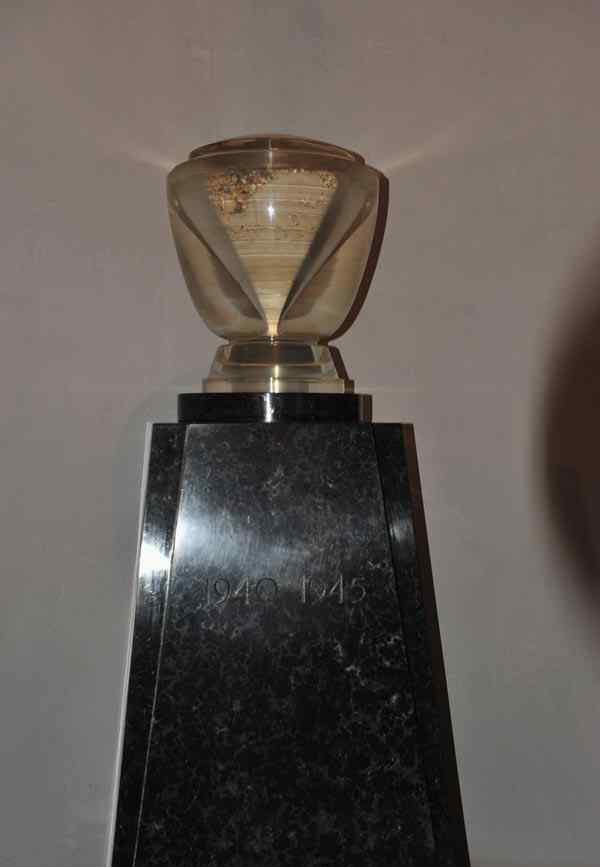 玻璃容器内装着死难者骨灰的集中营“殉难者博物馆”纪念碑(于世文摄)