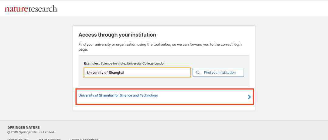 在“通过您的机构访问”下的选择框中搜索“上海科技大学”,点击“查找您的机构”,在结果列表中选择“上海科技大学”。