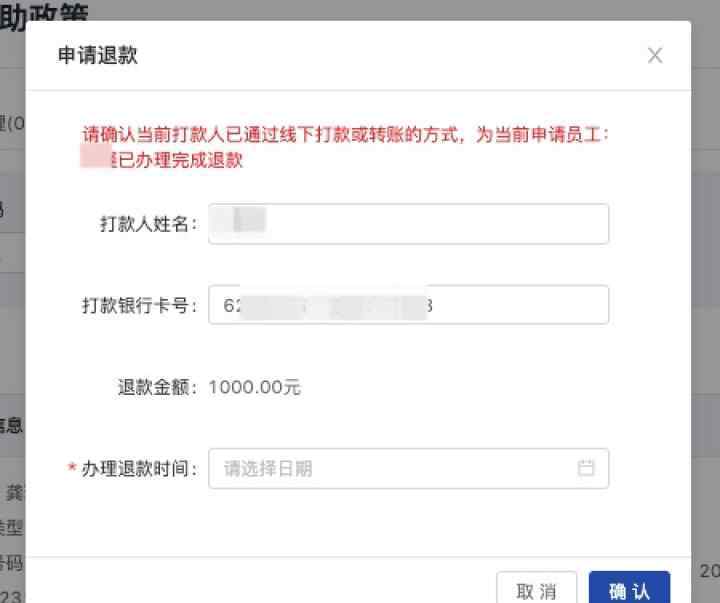 5. 输入打款人姓名、打款人银行卡号、退款转账日期,点击确认。