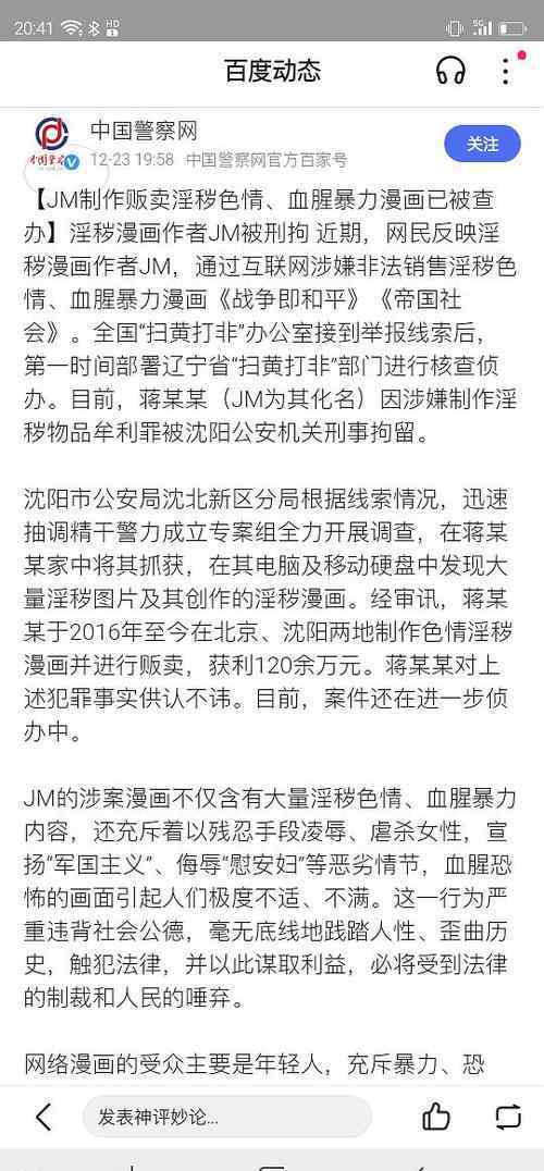 漫画作者JM涉嫌非法制贩淫秽色情、血腥暴力漫画被刑拘
