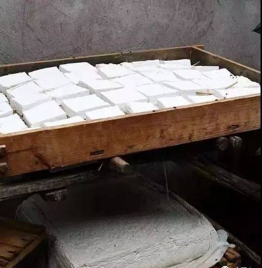 ⑥压豆腐,把豆花舀到专用的木器中,除水冷却后用豆腐刀划成块,做出的就是白豆腐;