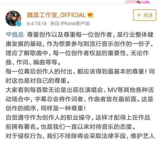 虽然只是几个短句,但这是抄袭。这是一首魏晨努力创作的歌曲。因此,魏晨仍然有很多粉丝非常不满,魏晨工作室对此事件做出了回应。他们说,尊重创作,尊重原作者,不排除通过法律保护艺术家的权益。