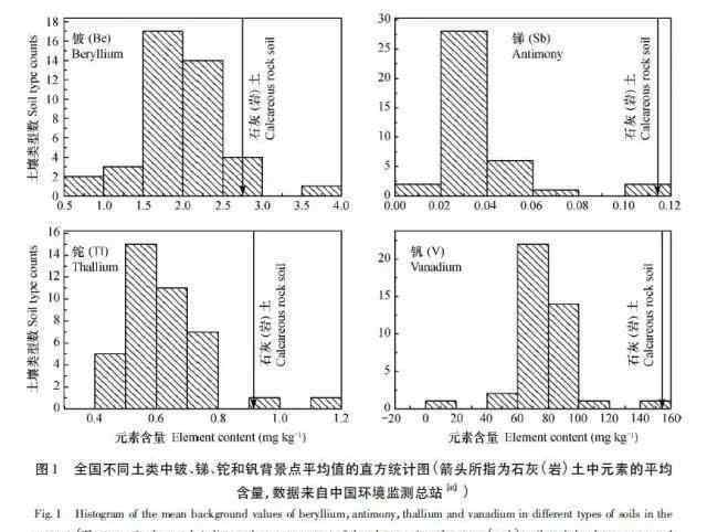 我国长江以南地区(如湖南、广西、贵州、云南等地)锑、铊、钒含量显著较高,部分地区形成地球化学高背景区。如图1所示,用直线统计图分析了我国不同土壤类型中上述元素背景点的平均值。研究发现,该土壤中锑、铊和钒的平均值明显偏离数据集的总体分布趋势,在所调查的土壤类型中成为极高值。因此,石灰(岩)土区这三种元素的高背景评价值得进一步研究。采矿和冶炼产生的大量固体废物(如废矿石、废渣和尾矿泥)是部分地区锑、铊、钒污染严重的主要原因,对当地居民健康造成极大危害。比如湖南某锑矿区土壤中锑的浓度在97mg·kg-1 ~ 4490mg·kg-1之间,远高于我国土壤中锑的背景浓度,且相当一部分以生物可利用的形式存在。由于黔西南金汞矿(伴生铊)资源的开发利用,废渣中的大量铊通过雨水的淋溶作用迁移到土壤中,造成环境铊污染,进一步污染蔬菜等作物,导致当地居民因长期食用这些蔬菜而慢性铊中毒。四川攀西地区是我国钒钛磁铁矿的主要成矿带。一些冶炼厂周围土壤中的钒含量是对照样品的16.5倍,植物中的钒含量是对照样品的6.6倍。钒钛磁铁矿矿区和冶炼区儿童血液中的钒含量高于其他地区。因此,针对已形成或已经形成的土壤中的铍、锑、铊和钒污染,迫切需要制定相关的土壤标准,并在此基础上进行风险评估和修复。