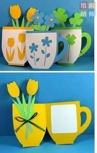 制作方法:让孩子把手掌贴在纸板上,画出轮廓,剪下形状备用;将绿色纸板切成枝叶形状,备用;将掌纹和枝叶纸板贴在白色背景纸板上,拼成花状图案。最后把白色背景版固定在较大的彩色纸板上,就完事了。这张贺卡不仅新颖有趣,而且非常值得纪念!