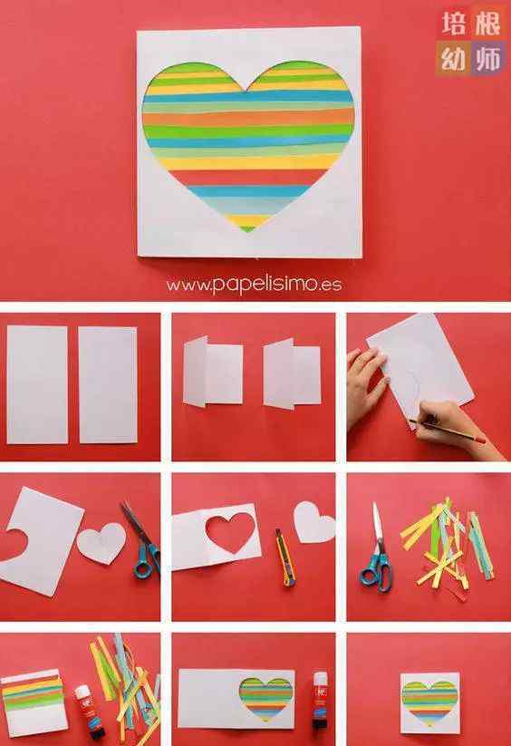 制作方法:将长方形纸板从中间对折,如图,用铅笔从中间勾勒出心形图案,裁剪掉;用各种纸板剪出若干彩色条,用胶水粘在贺卡内部,晾干;把贺卡放在一起,写一句问候的话。简单又有创意吗?