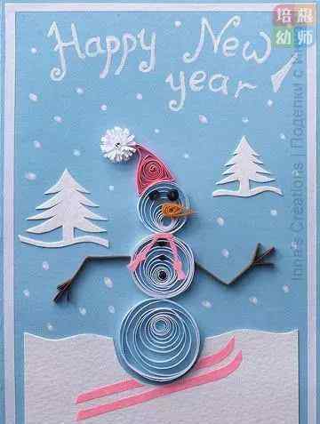 制作方法:用白卡纸剪下小树、雪花等小物件,如图,用细棍将雪人的头、帽子、身体部位卷出来,用胶水固定在一起;作为贺卡的主体部分,把之前做好的部分贴在贺卡上,然后用白刷修饰一下,就完成了!