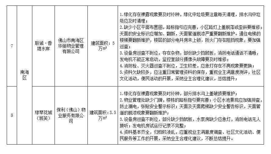 据了解,7月3日至7月17日,住建局从禅城、南海、顺德、高明、三水共选取4个物业管理小区20个,在佛山市房地产协会的协助下,随机抽取物业管理专家对物业管理小区的资料档案、设施设备、环境卫生等方面进行了专项检查。