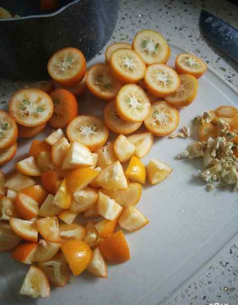 金桔柠檬洗净,金桔切成两半去籽,再切。如果更小,可以缩短烹饪时间