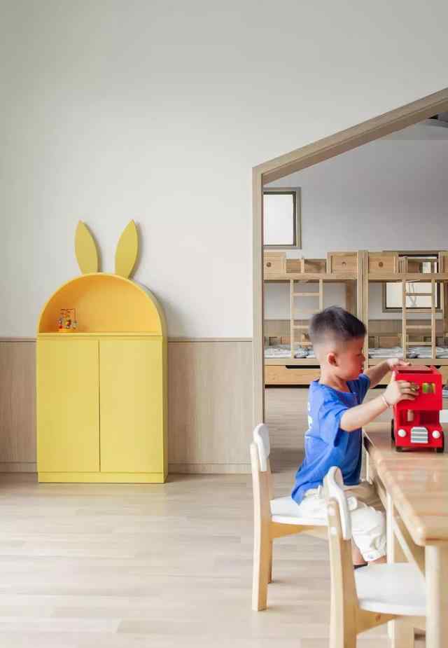 专为儿童设计的教学教室,结合墙窗和门洞,融入动画元素,使墙壁更加生动丰富。顶面的分裂云更灵活,层次更丰富。大面积原木色和白色的完美融合,再加上平滑柔和的对位,不仅柔和空,还具有一定的导向和方向感。